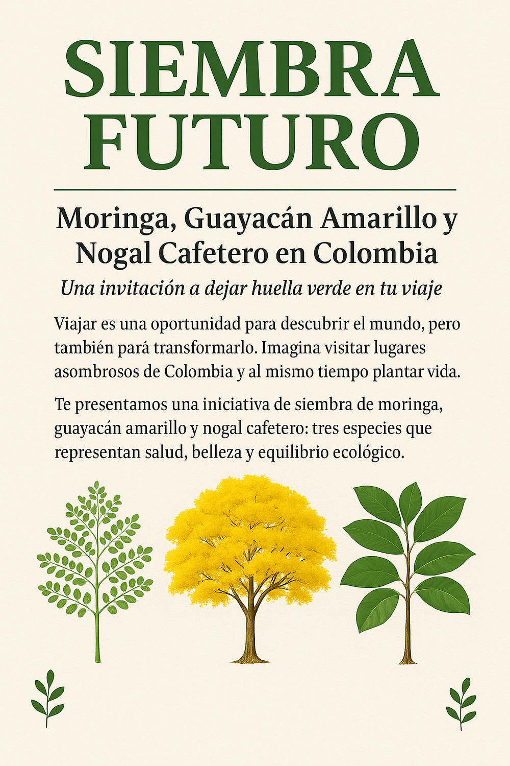 En Number Juan Travel, creemos que cada viaje puede dejar una huella positiva en el planeta. Por eso, lanzamos esta iniciativa para sembrar árboles en los territorios que recorremos con respeto y admiración. Con cada árbol donado, ayudamos a reforestar zonas afectadas, fortalecer comunidades locales y proteger la biodiversidad de Colombia.