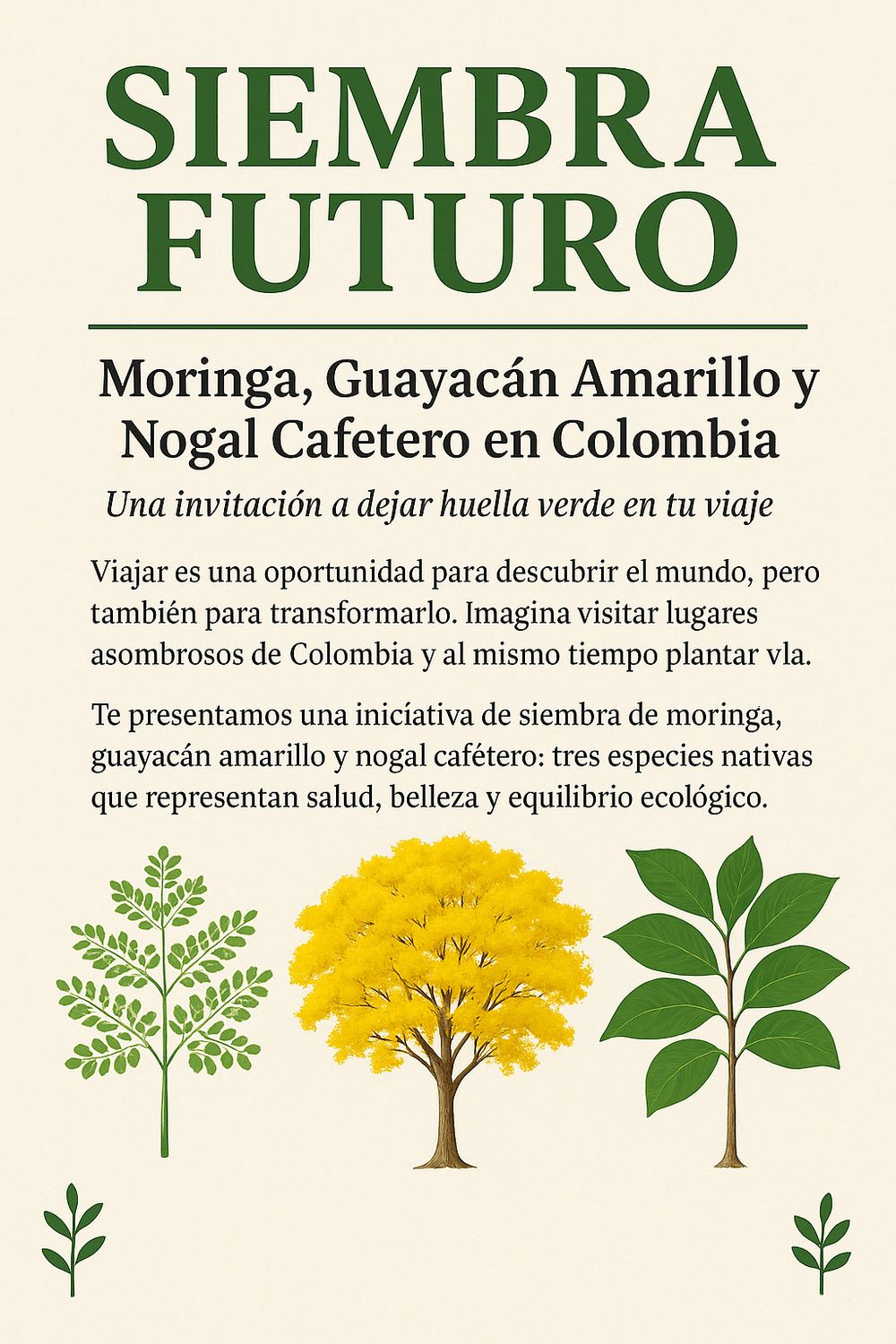 Nuestra siembra se concentra en especies como nogal cafetero, moringa y guayacán amarillo, cuidadosamente elegidas por su capacidad de enriquecer el suelo, atraer polinizadores, mejorar la calidad del ecosistema y fortalecer la biodiversidad. Estos árboles no solo reverdecen el paisaje, también cumplen funciones esenciales para regenerar la tierra y aportar bienestar a las comunidades.